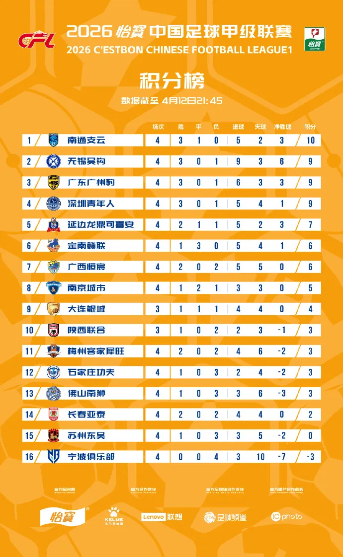 虎扑04月12日讯 2026中甲联赛第四轮比赛今日结束,本日赛况如下。大连鲲城1-2延边龙鼎48'刘云/2'乔瓦尼、90+5'多明戈斯石家庄功夫0-1佛山南狮25'比斯波定南赣联1-1南京城市67'埃里克斯/37’赵诚乐中甲联赛积分榜:来源:虎扑 虎扑04月12日讯 2026中甲联赛第四轮比赛今日结束,本日赛况如下。大连鲲城1-2延边龙鼎48'刘云/2...